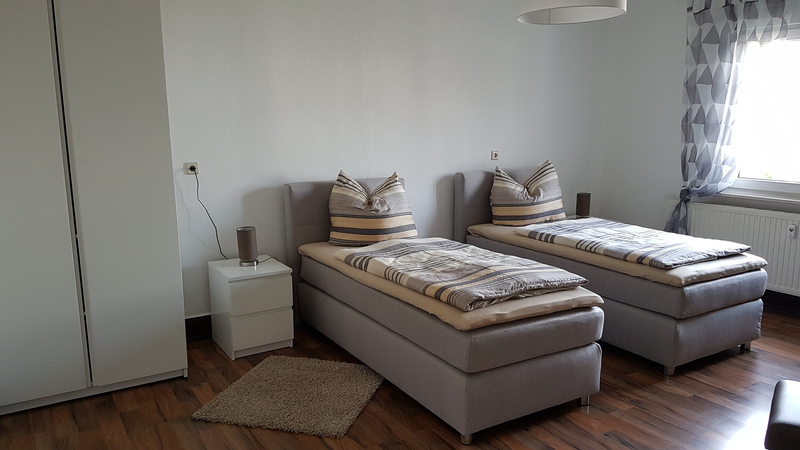 Dieses große Schlafzimmer im 1. Obergeschoss des Hauses hält 2 Boxspringbetten für Sie bereit, die bei Bedarf auch zu einem großen Bett zusammengeschoben werden können.