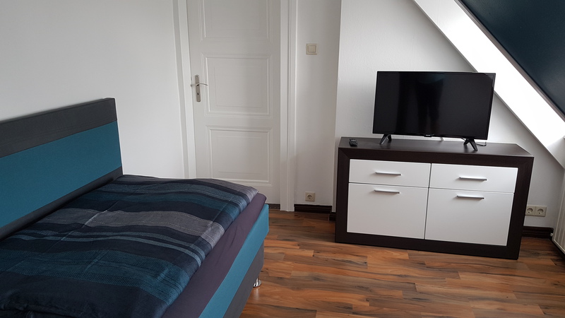 Im Einzelzimmer im 2. Obergeschoss des Hauses befindet sich ein Bett mit Nachtlicht, ein eigener Fernseher, eine Kommode und ein kleiner Kleiderschrank.